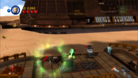 At the far end assemble some steps. Along the edge near the screen at the far end smash the cover to a hole, jump down and follow the grating through behind the blue barrier. Go to the left to get out and then pull the lever inside here to open the barrier. Then lightsaber smash the internal one. Go around the back of the crate and start pushing it along the tracks. This will complete the steps to allow all the characters to get up.