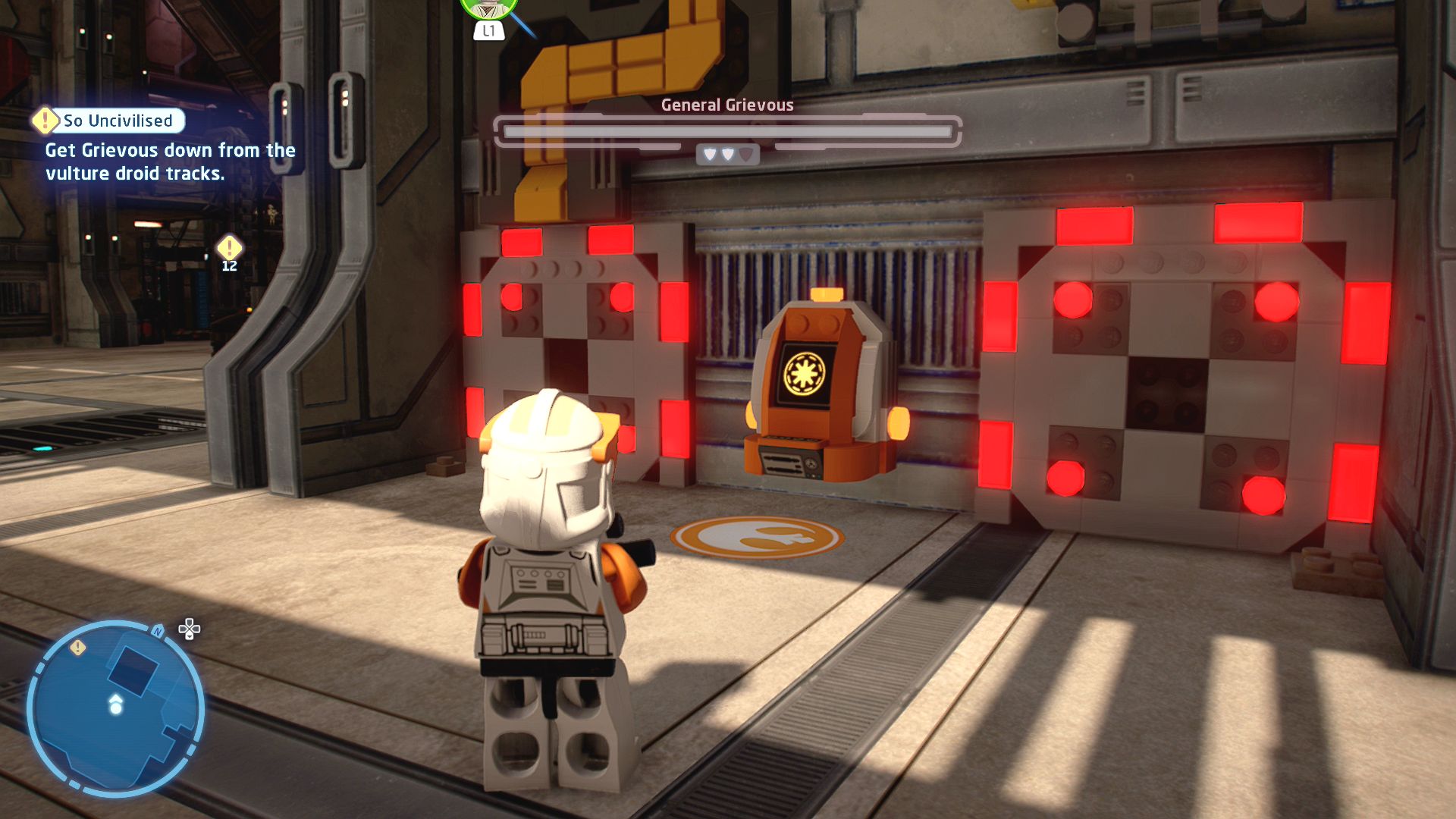 - Use a villain grenade to get into the room immediately to the left at the start of the level and then have a protocol droid activate the droid in here using the panel on the wall.