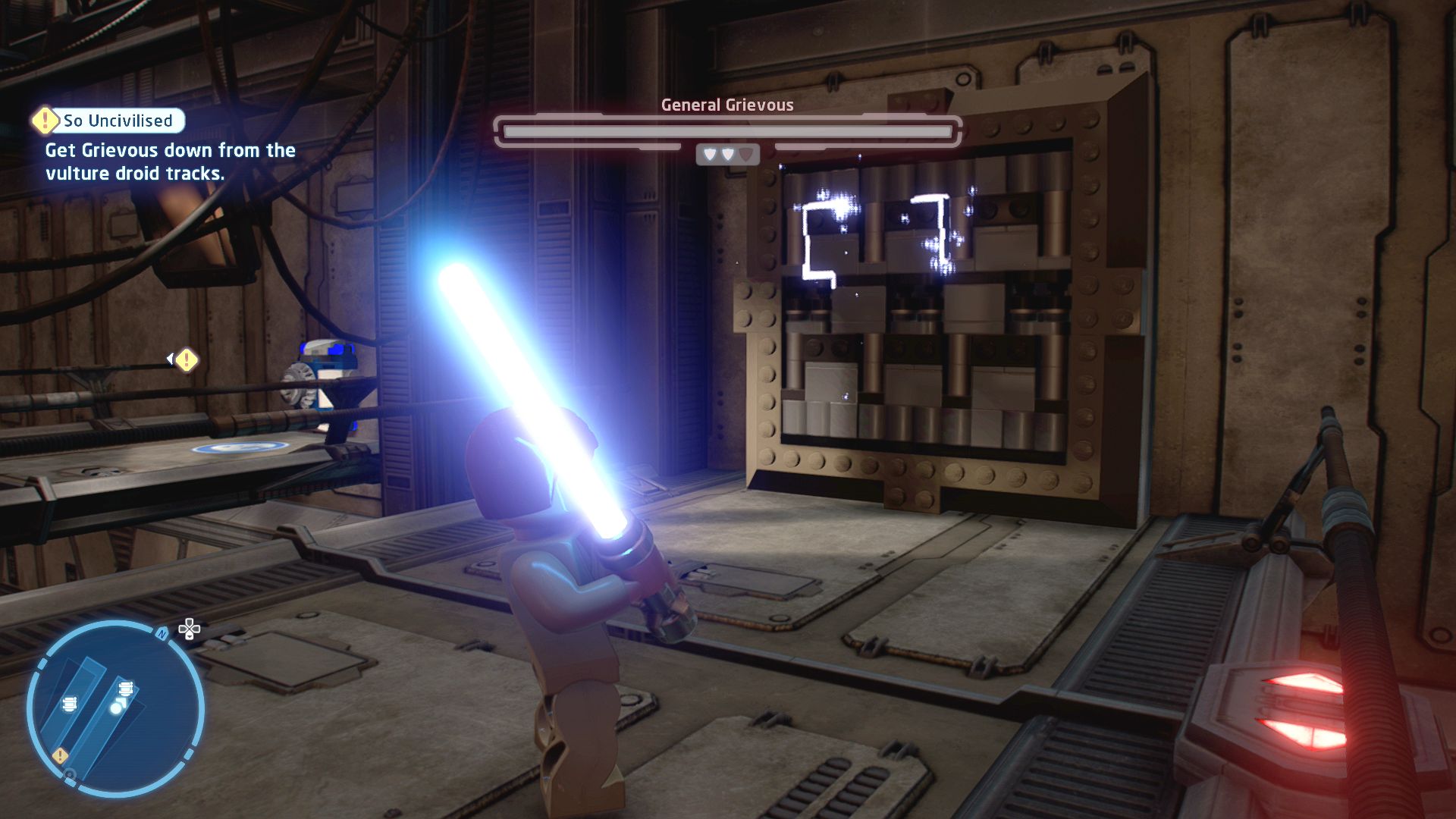 Behind that door is another room with some battle droids inside it and a few giant screens with General Grievous on them. Once you've defeated the droids Artoo will helpfully replace the screens with giant arrows telling you to go left.