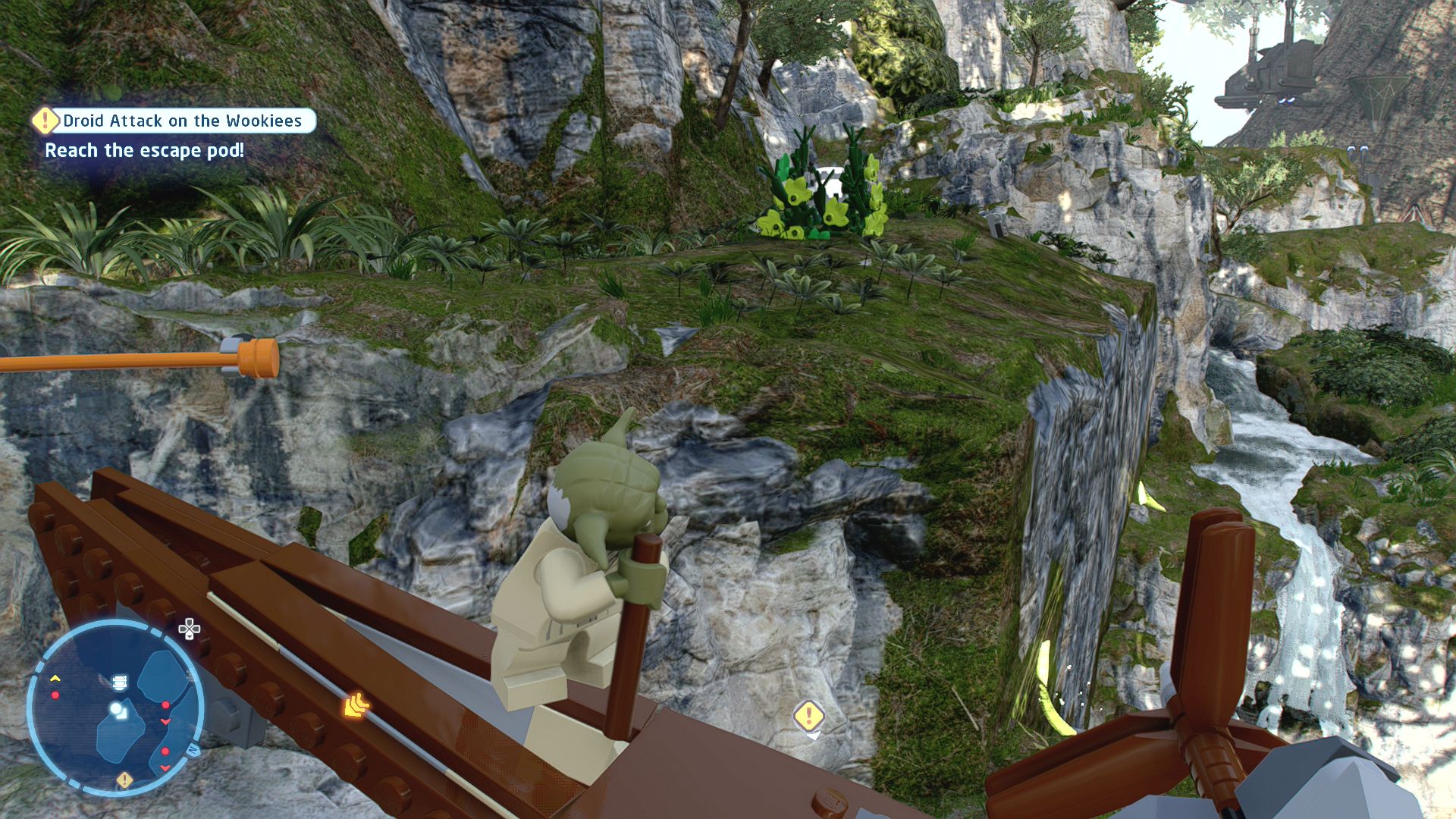 While Obi-Wan is busy it's time to for R2-D2 and C-3PO to help. Step into the gust of wind coming from the machine the Mustafarian breaks and then defeat the two enemies that crash in front of you. Once they're dead smash the vehicles they crashed to get the parts to build a double button that both characters will need to stand on.