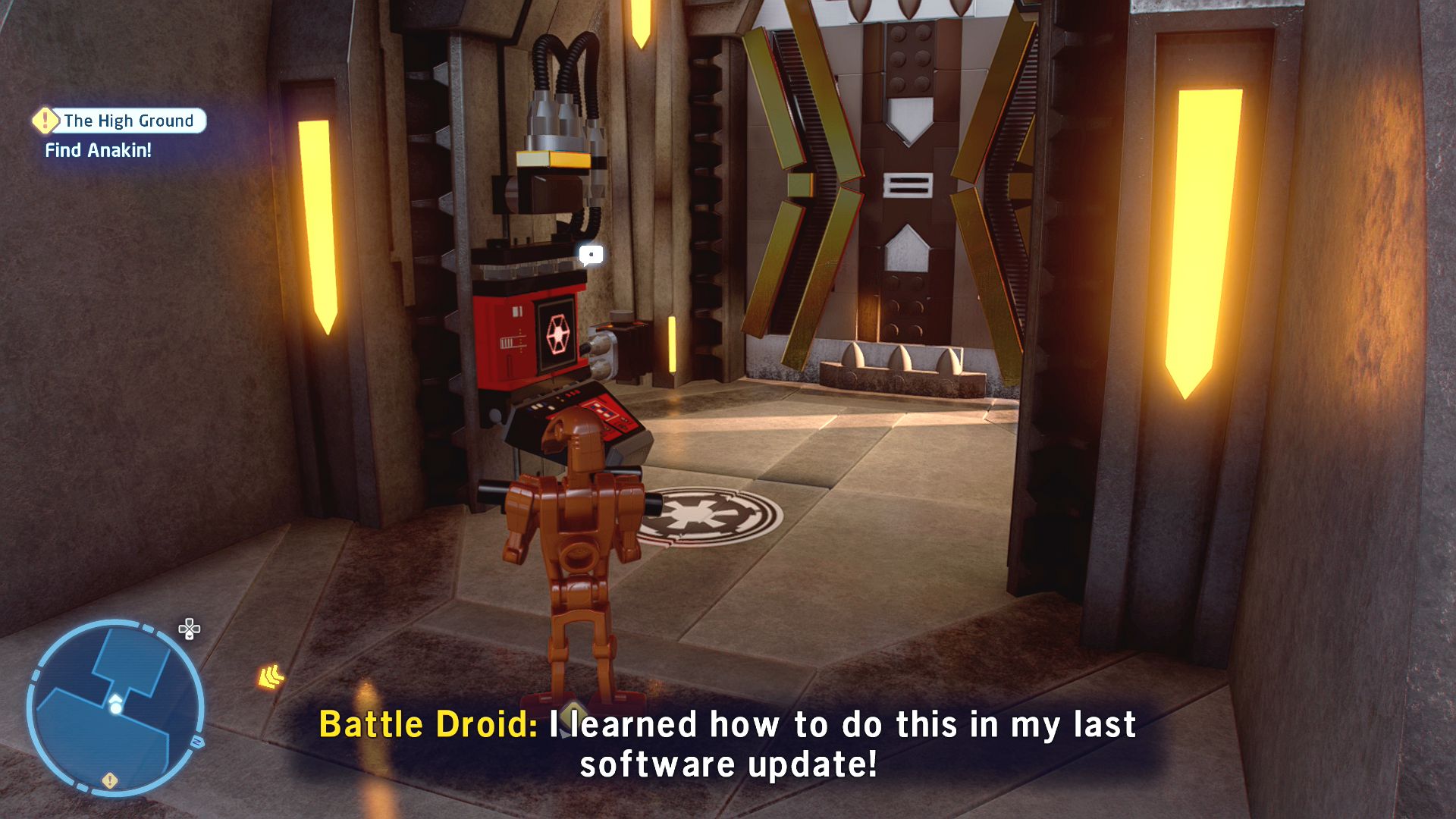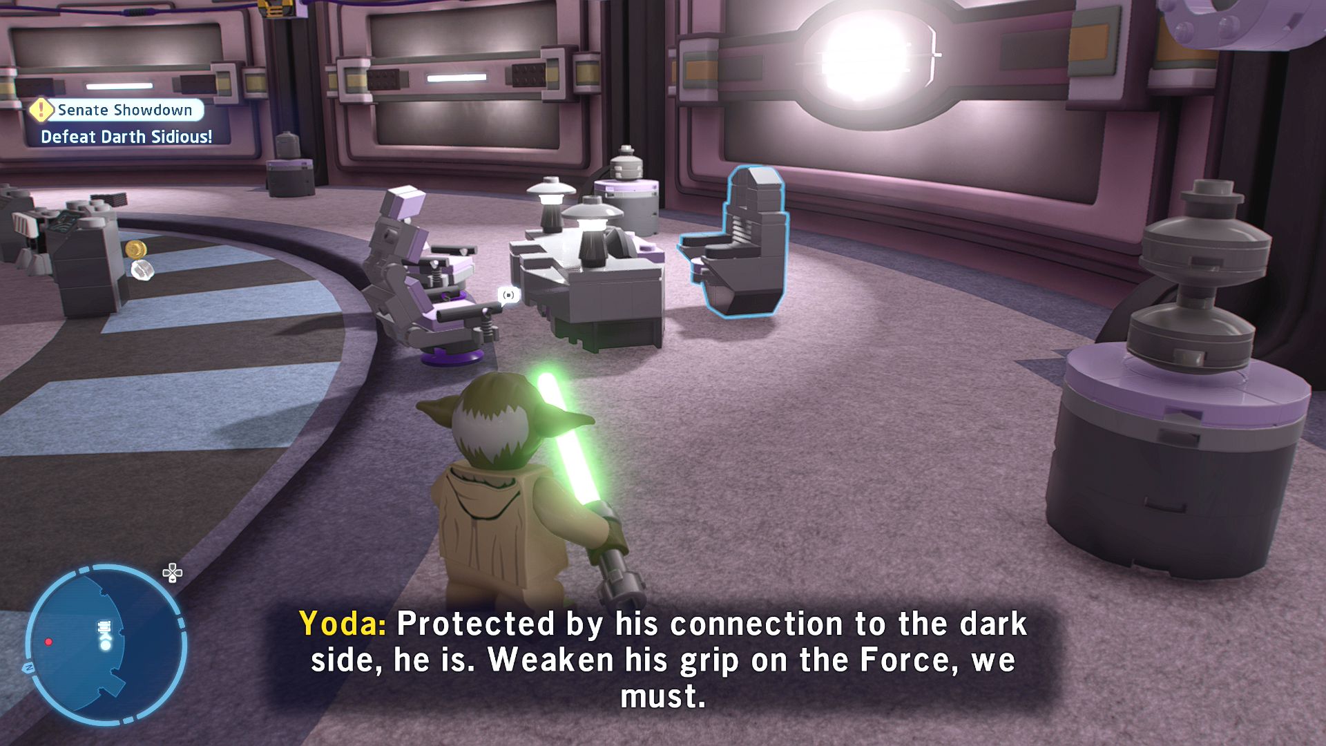 Further ahead passing another laser fence on your right you'll encounter a Droideka. Defeat it and R2-D2 will help clear the way again. Go through the far doors to enter the bridge where you'll find Palpatine.