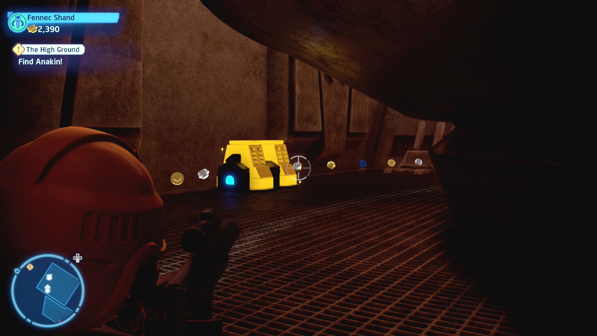 On the north-western side of the starting area is a section you can only reach via grappling hook. Shimmy in there and then use a Bounty Hunter to smash the gold LEGO console.