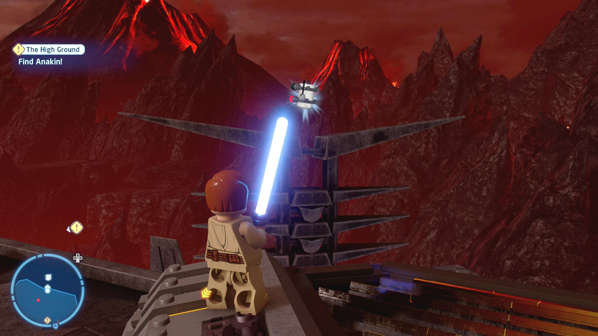 Back to Obi-Wan follow Anakin along the pipe and have a lightsaber clash in the middle. Jump down and have another regular lightsaber fight with him while avoiding the lava projectiles that keep flying in.