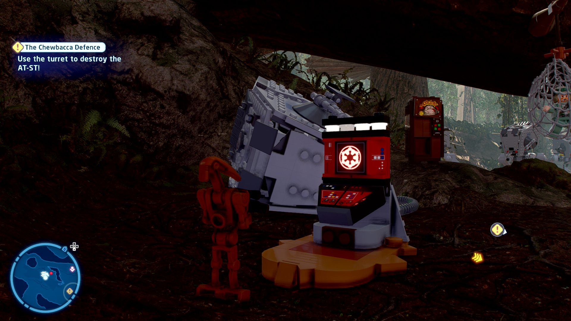- Take the Ewok Horn path and when you get to the AT-ST that you would normally shoot with the turret you should instead shoot the Gold LEGO up to the right to release a pile of logs. Normally you need a Bounty Hunter to break Gold LEGO but you can just use the turret this time.