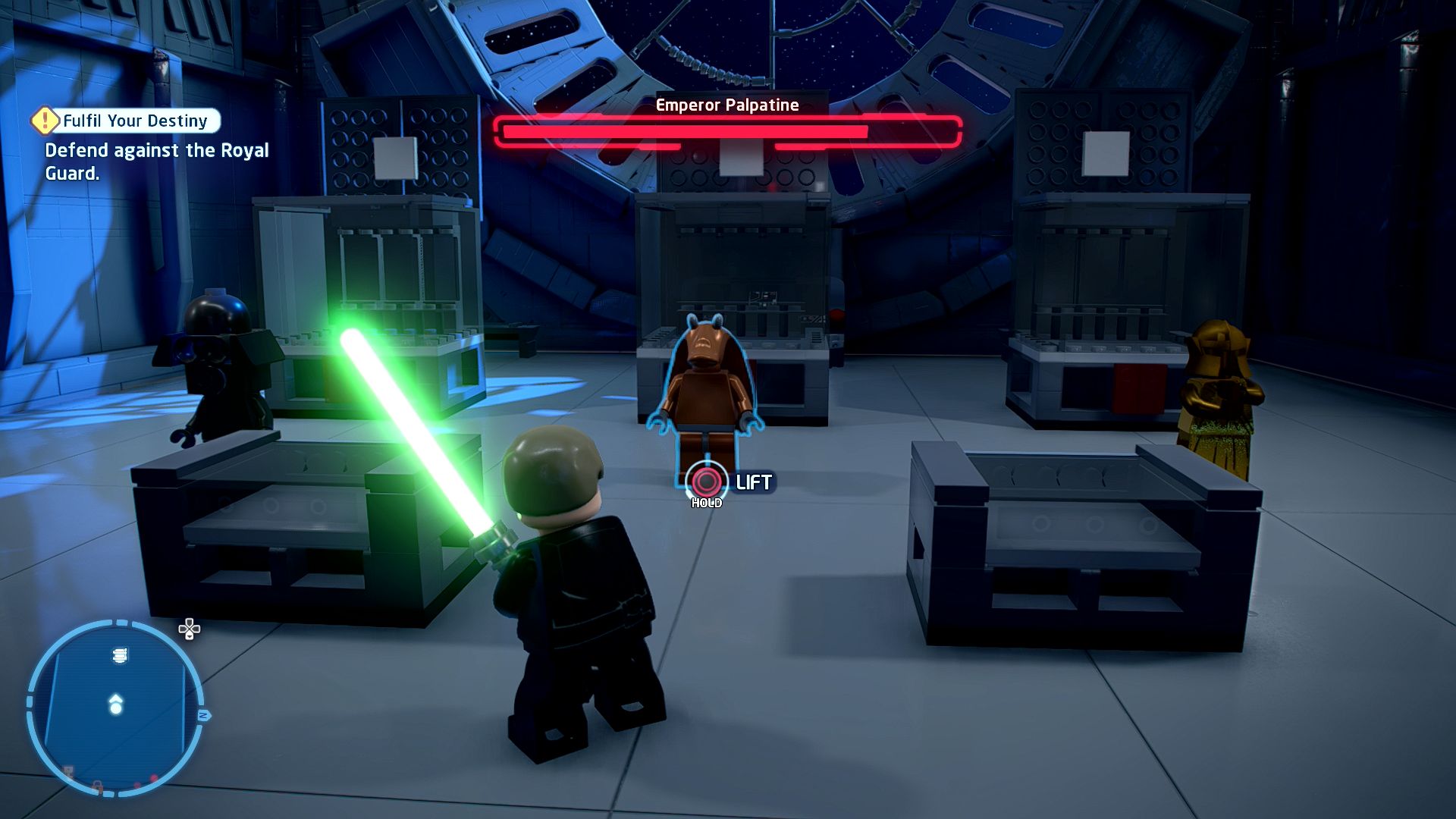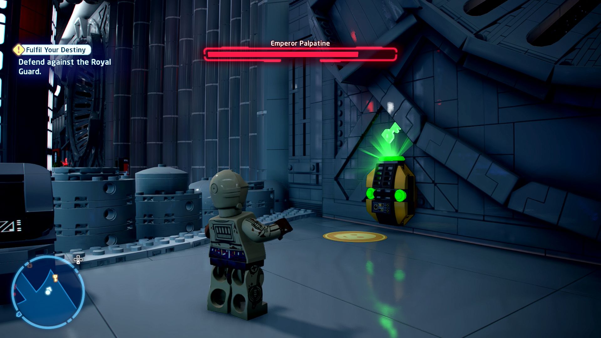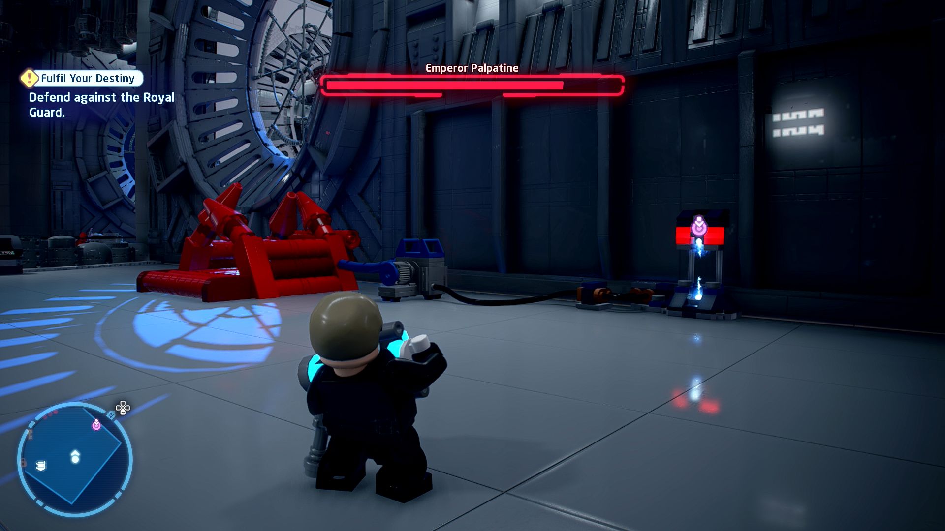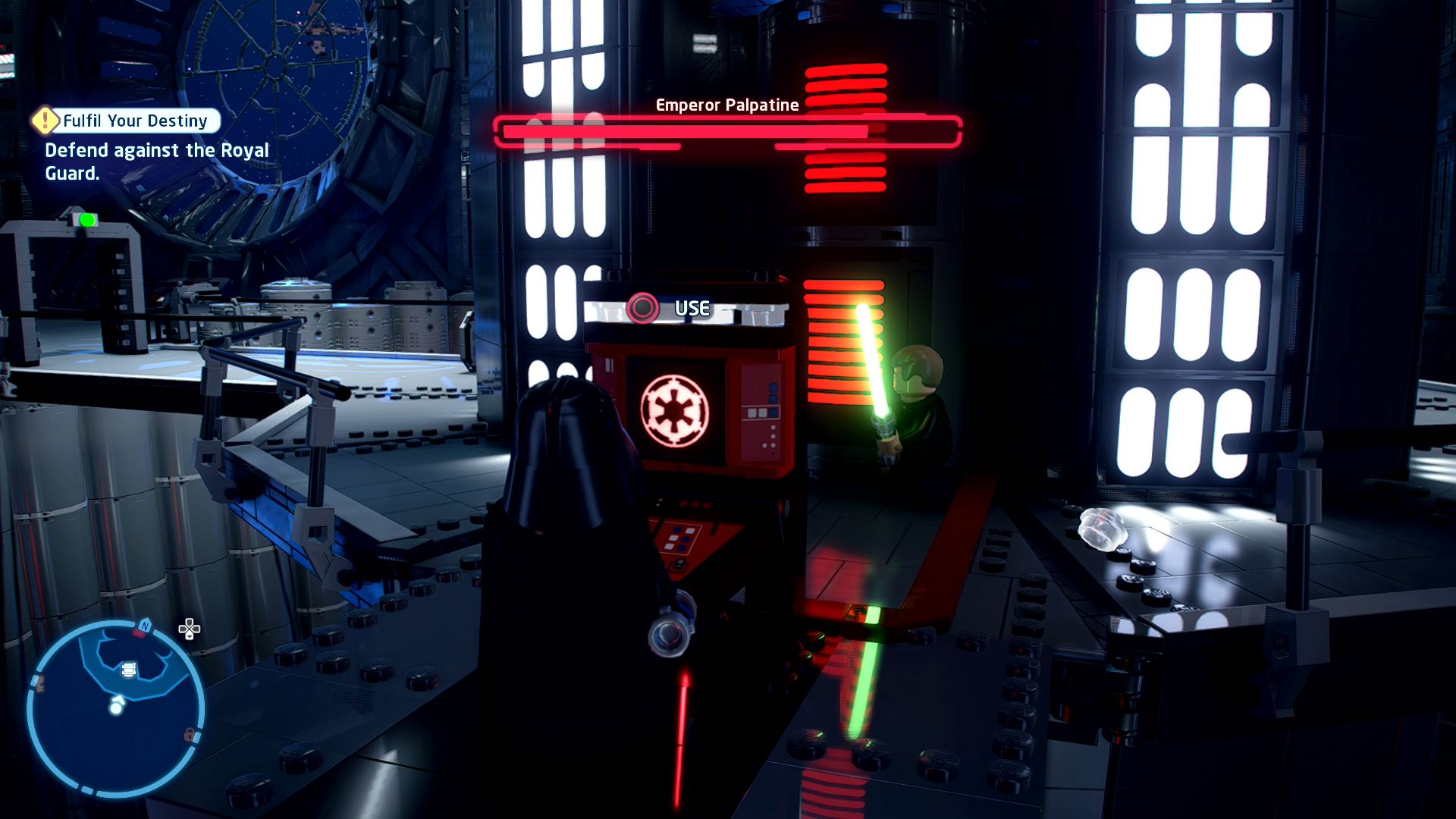 When he gets damaged he summons some Royal Guard to attack you while also sending bolts of Force Lightning at you clearly marked by red circles on the ground. This will all repeat until you're over halfway through Emperor Palpatine's health and he jumps down off his platform.